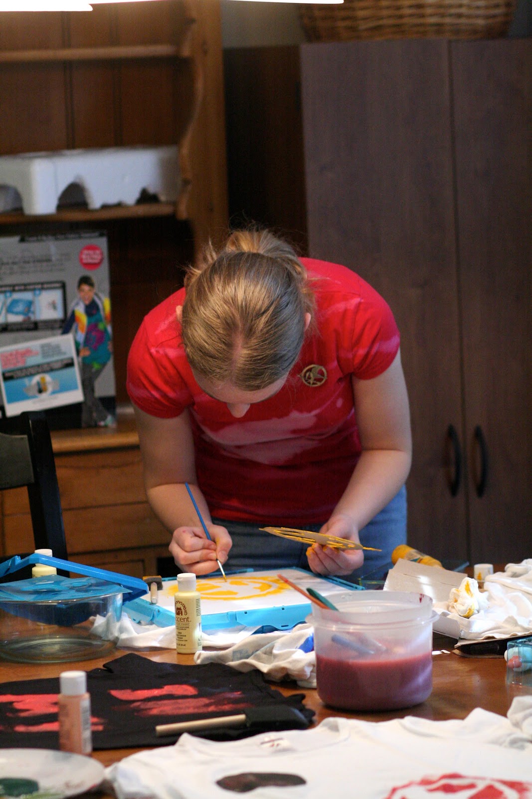 After the Thursday night excitement of finding the Mockinjay pin, Kassy had to wear it to co-op Friday morning. I was a little startled as I unloaded the car to hear a scream coming from the other side. As my head darted around to it's source, I discovered that it wasn't necessarily so much a scream as it was a squeal of delight from another teen Hunger Games lover. The site of the Mockingjay just does that to them I guess. It also inspired Kassy and a few friends to gather 'round our kitchen table that afternoon to make Hunger Games t-shirts for the upcoming movie premier.